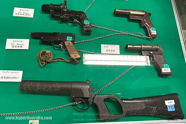 左上から下へ、新中央工業 21.5mm信号拳銃(試作)、新中央工業21.5mm信号拳銃、ウェブリー&スコット 信号銃 MK1、右はツーラ・アーセナル造兵廠 信号拳銃。