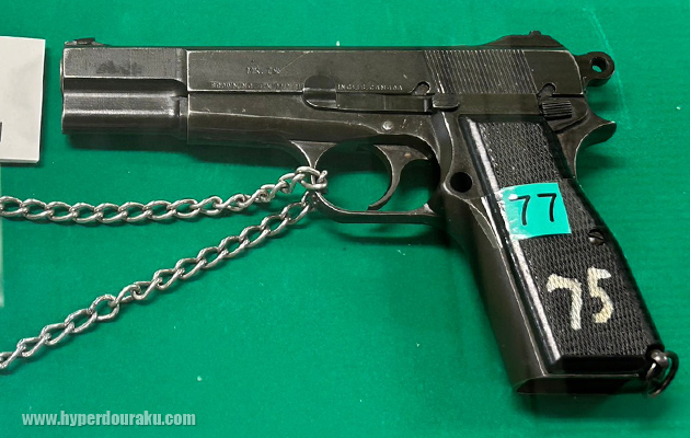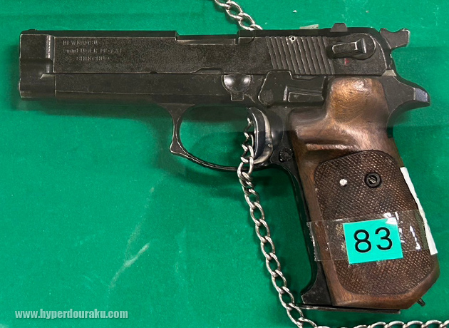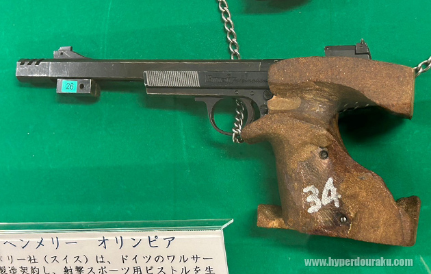 ヘンメリー オリンピア。スイスのヘンメリー社は、ドイツのワルサー社と製造契約し、射撃スポーツ用ピストルを生産し、多くの競技者に使用された。この銃は体育学校で使用されていたもので精密な射撃が安定してできるように選手の手にぴったりと合うようグリップを削って調整し精度を高めた。