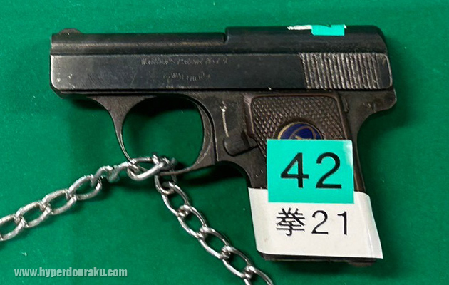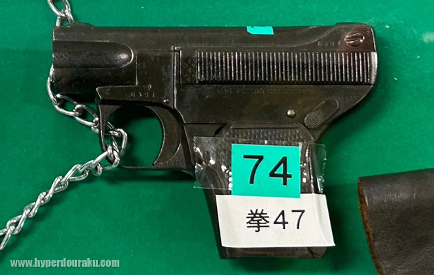 旧日本軍 九〇式二連装信号拳銃。この信号拳銃は、発射時に銃身を後座させて発射反動を失くしたうえでバネにて副座させるとともに一つの引き金で二銃身、三銃身どちらのタイプの銃身からでも自由選択で発射できるなどの機構を持つ独創的な国産発明品。萱場製作所製造。昭和4年から旧軍に本採用となり、昭和16年12月の真珠湾攻撃において、南雲中将がこの三連装信号拳銃で全艦隊に攻撃開始の合図を行い、また淵田中佐率いる第1次攻撃隊が放った有名なトラトラトラの信号も同型の二連装信号拳銃によって発せられた。
