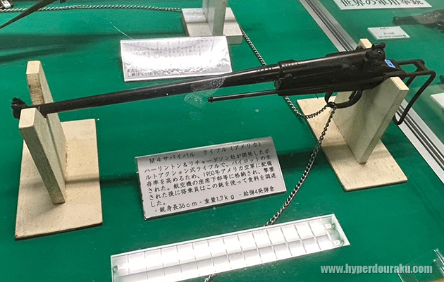 M4サバイバル ライフル。アメリカのハーリントン&リチャードソン社が開発したボルトアクション式ライフルで、パイロットの生存率を高めるため、1950年アメリカ空軍に配備された。航空機の座席下などに格納され、撃墜された後に搭乗員はこの銃を使って食料を調達した。銃身長36cm、重量1.7kg、4発弾倉。