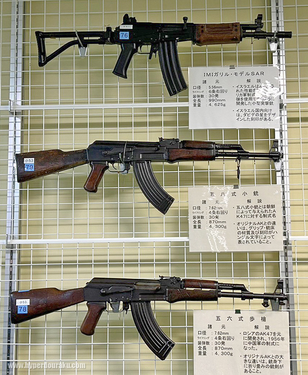 五六式歩槍 (下)。中国でAK-47をもとに開発され1956年に中国軍の制式となった。オリジナルAKとの大きな違いは、銃身下に折り畳みの銃剣があること。