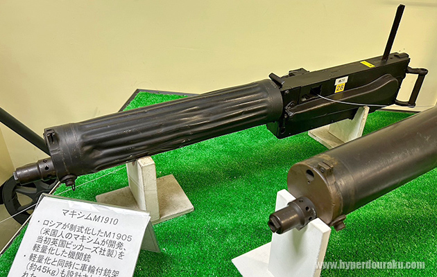 マキシムM1910。ロシアが制式化したM1905(米国人のマキシムが開発、当初英国ピッカーズ社製)を軽量化した機関銃。軽量化と同時に車輪付き銃架(約45kg)も設計され使用された。信頼性・耐久性に優れていたため第二次世界大戦まで使用された。口径7.62mm、装弾数250発布製弾帯、重量23.8kg。
