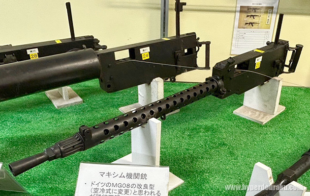 MG08。マキシムM1908とも呼び、アメリカ人のマキシムが開発したマキシム機関銃を、ドイツで制式化したもので「シュパンダウ」と呼ばれ第一次世界大戦で使用された。ドイツ製マキシム独特の付属品として銃架があり、銃架をソリのように利用し、兵士一人でも運搬できる。