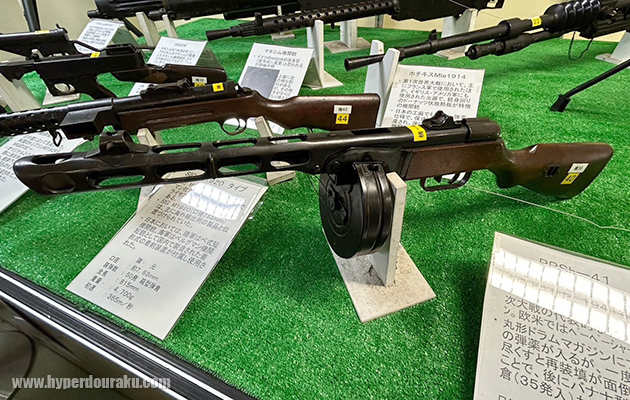PPSh-41。第二次世界対戦でソ連が使用した短機関銃で1941年より配備開始。丸型ドラムマガジンに71発の弾薬が入るが、一度撃ち尽くすと再装填が面倒と言うことで、後に35発のバナナ型弾倉も加えられた。欧米ではペーペーシャとも呼ばれる。