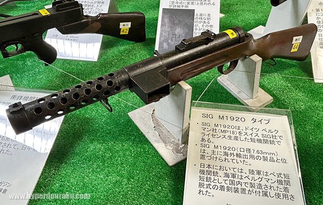 SIG M1920タイプ。SIG M1920はドイツベルクマン社MP18をスイス SIG社でライセンス生産した短機関銃。口径は7.63mmで、主に海外輸出用の製品と位置付けられていた。日本においては陸軍はべ式短機関銃、海軍はベルグマン機関短銃として国内で製造された着脱式の着剣装置が付属し使用された。口径7.63mm、50発箱型弾倉、重量4.7kg。