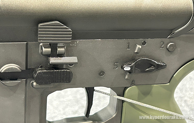 セレクターは2点バーストを含む4ポジション。左面の場合、S(安全)を中心に、時計回りに回すとセミオート、さらに回して2点バースト。Sから反時計回りでフルオートポジションとなる。