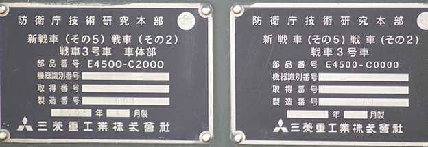 名盤は2枚が設置されており、左が車体、右が砲塔のためのものと推測される。名盤を見ると、3号車であること、部品番号、機器識別番号、取得番号、製造番号、製造時期、製造者が記載されていることが判る。試作0号車と4号車は公開されておらず、名盤が確認できていない。また、試作0号車という呼称は、防衛庁から制式に発表されたものでは無く、筆者が便宜的に付けた呼称であることに留意してほしい(別に正式な呼称がある可能性がある)。
