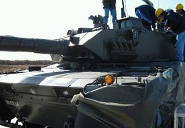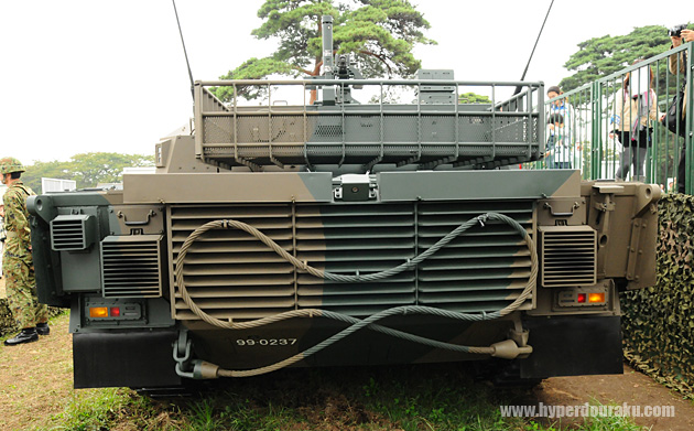 図11:技術研究本部のホームページに掲載された試作4号車の写真。車体前面下部に地雷処理ローラーの取り付け部が設置されている点が最大の特徴。また砲塔側面のモジュールが外されており、それを固定するための基部らしきもの見える。防衛庁技術研究本部ホームページより抜粋