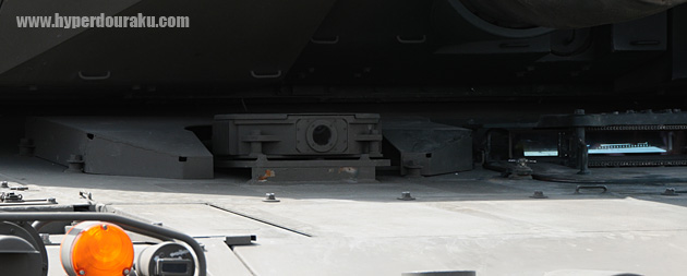 10式戦車の側面とキャタピラ部分。ステルス性向上のためゴム製のスカートを履いている。