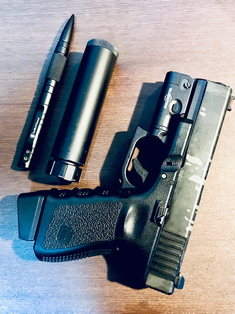 狭く、暗く、物が溢れる閉所のため、今回は亜音速の9ミリ拳銃とライトの組み合わせを選んだ。