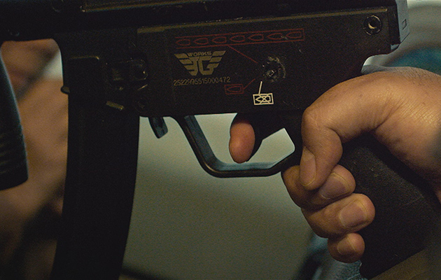 ところでこの銃がアップになると、レシーバーにエアソフトガンであることを示す刻印が確認でき、またカットによっては一部のパーツが脱落している事も(笑)。じつは香港は日本と同じくらいトイガン文化が発展しており、発砲シーン以外ではエアソフトガンが撮影に用いられることが多いのだ。
