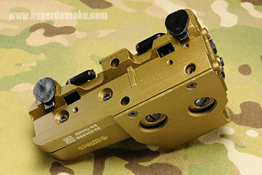 このEOTech 553はホロサイトの中でもベーシックなミリタリータイプで、標準的な軍用ライフルのフラットトップレールにベストマッチ。今回はタンカラーなので、SCAR-LのFDEに搭載。ちょっとゴールドにも見える塗装色がゴージャスな雰囲気。電池カバー部左右にはL3 EOTechのマーキングが入る。