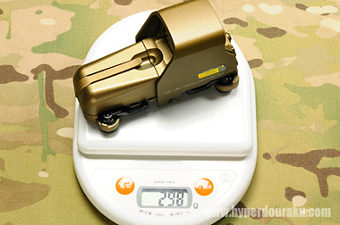 EOTechの553ホロサイトレプリカ。実物のホロサイトは航空機や自動車のヘッドアップディスプレイ(HUD)などと同じレーザー投影式の照準機器でLED投影のドットサイトとは点灯方式が異なる。
