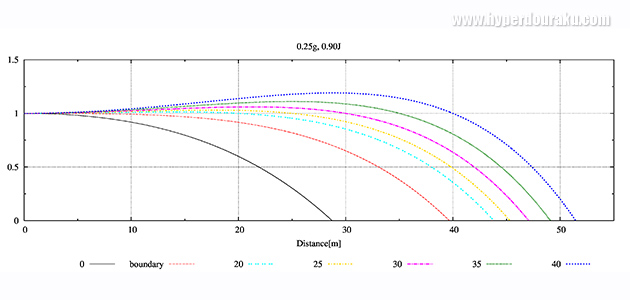 威力0.9ジュールのエアガンであれば水平に狙ってマンターゲットに当てられる最大距離は40mちょっとといったところだ。距離によってホップ弾道は変化し、0.25g弾を40mでホップゼロインした場合では最大で20cmほど浮き上がり、50m付近の地面に落ちる。
