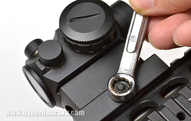 上部がエレベーション、右側面がウインデージの調節スクリューだ。手で直接回すのは無理で、マイナスドライバーか、小さめのコインなどが必要。「UP」「R」と矢印が書かれているが、書かれている通りの方向に回すと書かれている通りの方向にドットが移動する。