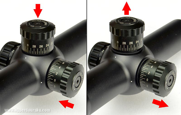 エレベーション調整ノブには「UP/DOWN」、ウインデージ調整ノブには「Right/Left」と書かれた矢印が印刷されている(片方だけの場合もある)。書かれている方向に回すことによって、レティクルがそちらに移動する。