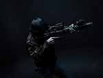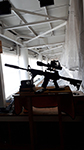 ・ガンをシルエットにしました。シューティングレンジという事ですが、雰囲気があります。狙撃へ臨む状態、もしくは狙撃後なのか、空間の持ち味をうまく使って雰囲気を高めています。机から下の部分をトリミングすると画面が整理されます。(トモ長谷川)