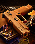 ・メインのガンがしっかり置かれ、背景が邪魔にならないよう配置されています。全体に赤味が強くなってしまいましたが、ライティングも凝っていて、撮影者の工夫と努力を物語ります。カートリッジが等間隔に置かれている点、マガジンがマズルとグリップのちょうど間に置かれている点が惜しいです。(トモ長谷川)