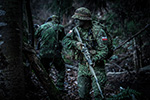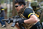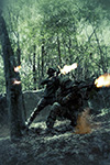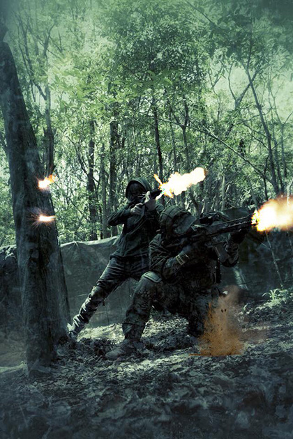 ・激しいマズルフラッシュ! 着弾の土煙など激しい戦闘の雰囲気が演出されてます! 縦位置ではなく、横位置であれば、迫力があったかと。樹への着弾が火を吹いているのはちょっと……。(トモ長谷川)