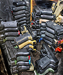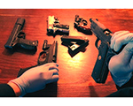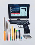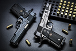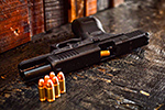 複数のガンを一緒に撮影するのは難易度が一気に高まります。難しいカットにチャレンジしました。スライドの上面や後端、フレイムの下面がライティングできれば、さらに良くなります。(Tomo) 銃の配置や光の当て方が上手いです。シンプルなバックなので、銃が際立っています。(戸井)