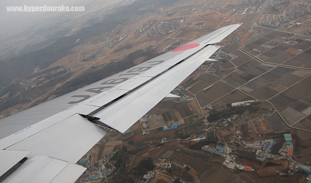 で、あっという間にソウル上空。ソウル郊外には高層タワーマンションがニョキニョキ建っていた。建築ラッシュのようにも見える。ソウル市の人口は約1千万人。韓国の人口は約4800万人なので、約5分の1の人口が集中している。