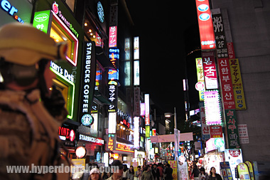 夜の明洞はネオンが眩く、さながら渋谷か池袋の繁華街と言ったエネルギッシュな雰囲気。