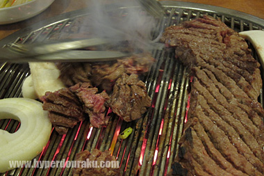 お肉を炭火でじゅうじゅうと焼き、チョキチョキとハサミで切り分ける。