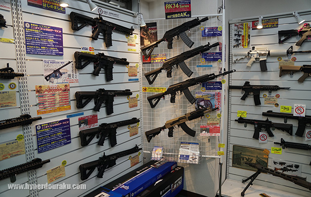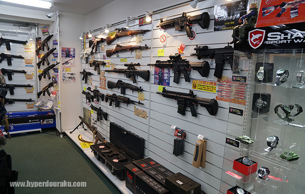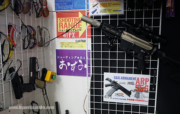 秋葉原に2015年9月にオープンした41PX。G&Gオフィシャルショップを掲げ、数多くのG&G電動ガンを壁一面に展示。そしてこれら電動ガンはほぼすべてが試射可能。