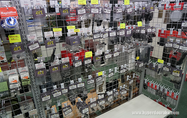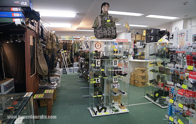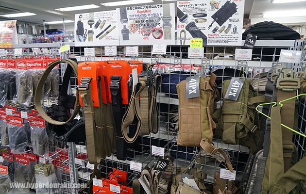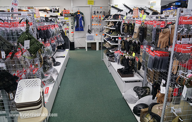 プレキャリや迷彩服などの装備類も充実し、サバゲー用品は一通り揃う。