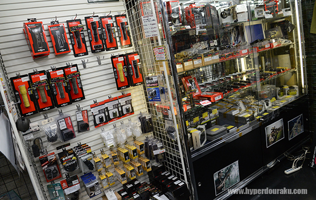 SURE FIREなどのライト系のほか、ドットサイト等の光学照準器やカスタムパーツ、雑誌類もあった。