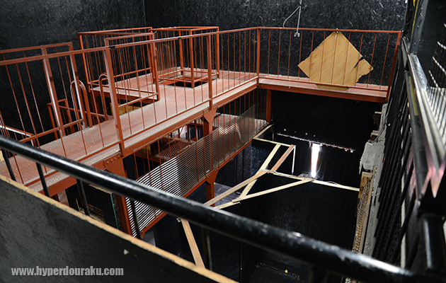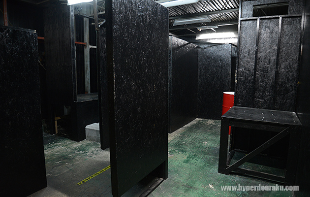 黒壁のバリケードでちょっとした迷路のようなフィールド内部。壁には可動式のトラップドアや、足元には穴が開いていたりして意外なところから狙われる可能性がある。