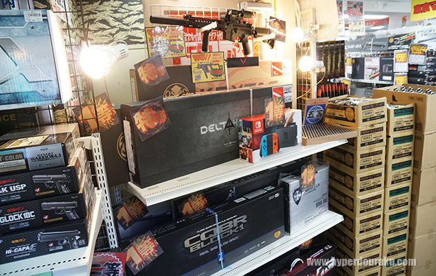 店内にうず高く積まれた東京マルイやクライタック、G&Gのエアガン達。