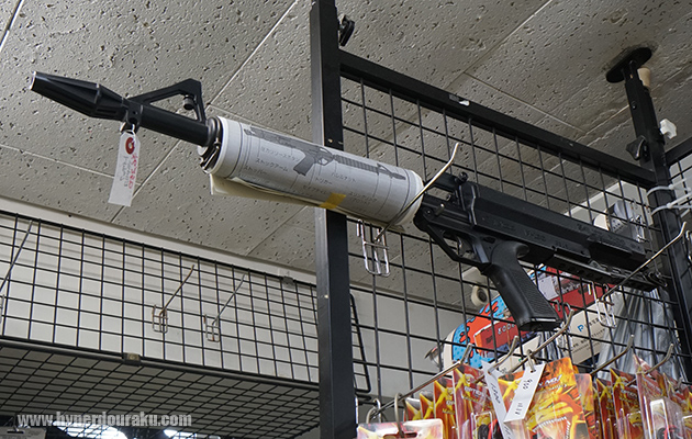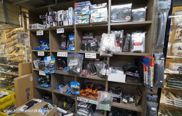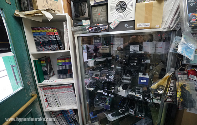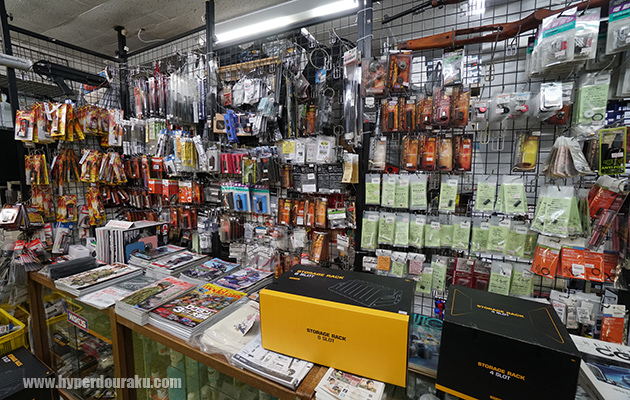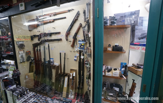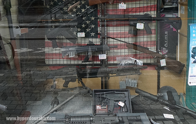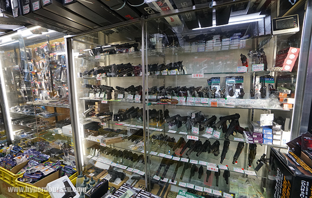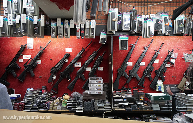 店舗に入ると奥に長く左右には所狭しと商品が展示されている。レジカウンター後ろにはマルイやVFC、G&G、バトンなどの長物ガスガン。