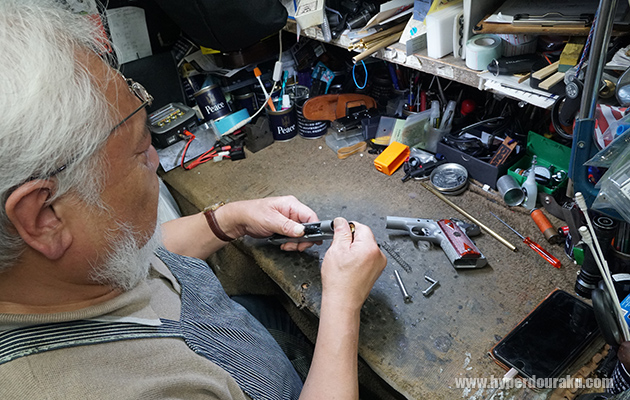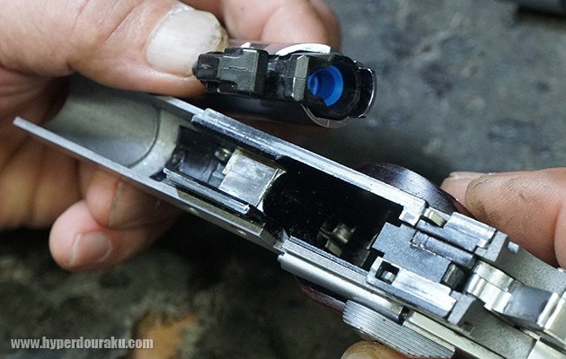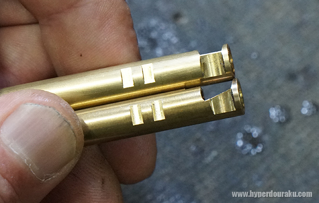 バレル長が短いハンドガンの場合は4重嵌合式のバレル構造を組み込んでいるそうだ。写真は東京マルイのV10を加工している。