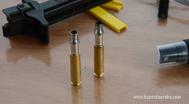 空薬莢はネックより上の部分が伸びている。よくエジェクションポートにあたらずに排出されるものだ。