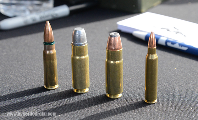 AKの7.62mm×39弾(左端)と、5.56mm×45弾(右端)と比べてみても重そうな弾頭。