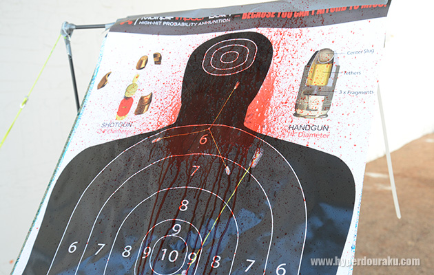 決して非致死性のものではなく、解説ビデオでは豚肉などに対して凄まじい効果を発揮する模様が映されていた。 2発ほど弾をもらったので週末にレンジでペーパーターゲットを撃ってみたのだが、どうにも紹介映像のような効果にならず、眉唾物な雰囲気が...。