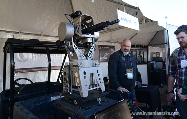 Paradigm SRPのTALONガンスタビライザーシステム。移動中の車両や船舶からの射撃時に銃を安定して撃つためのマシン。サーボモーターと電子ジャイロを使用してコンピューターが姿勢制御し銃座を安定させる。