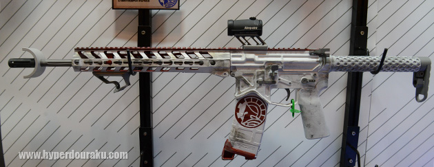 コンペティション用の3 GUN ENHANCED CARBINE。MAGPUL MIADグリップやMOEライフルストック、AP Custom USAのカーボンハンドガードが装着された16インチバレルのライフル。赤いレシーバーが派手。