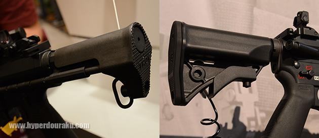 Troyなどに代表されるシャフトアーム式のPDWストックや、LWRCのUltra Compact Stock、LMTのショートストック、MAGPULのMOE SL-Kなどいろいろな種類が見られた。