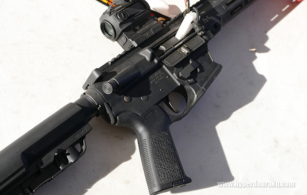 こちらのM&P15にはCRIMSON TRACEのLINQが装着されていて、これはグリップとハンドガード先端に装着されたレーザーライトモジュールをワイヤレスで操作するシステム。グリップハンドでスイッチを操作するとレーザーやライトが点灯する仕組み。
