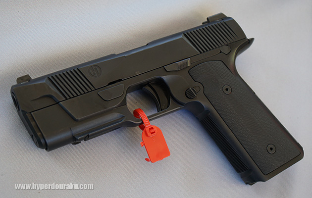 HUDSONのH9。1911のようなシルエットながら、9mm口径で、低い重心の独自のリコイルスプリングユニットが搭載される。スチール製で964gと意外に重い。