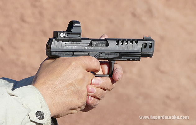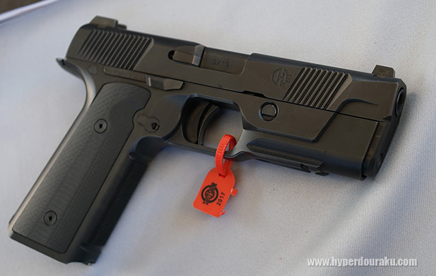 Q5 MATCH。いわゆるマッチガンの9mm拳銃。肉抜きされたスライド、軽いトリガー、スライド上にミニドットが搭載できるマウント有り。