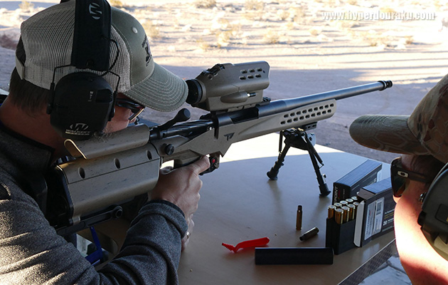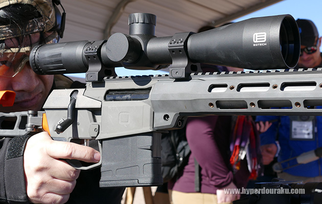 BARRETTのMRAD。ボルトアクションながらARライクな操作性で、口径は.338ラプアや.308Winをはじめ、様々な中口径ライフル弾に対応する。