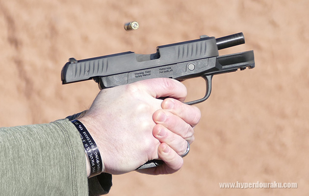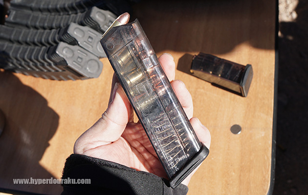 ARMSCORの.22 TCM弾を使用する拳銃を撃った。ボトルネック形状で40グレインの弾頭を初速850m/sで撃ち出し、944Jのエネルギーがある。これは9mmパラや.357SIGも大幅に上回る。