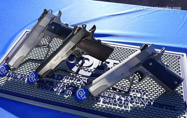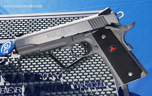 コルトの新作は懐かしの10mm口径のDELTA ELITE Rail Gun。グリップの赤い三角マークが素敵。アンダーマウントレールがついたり、新形状のグリップセフティになっていたりする。