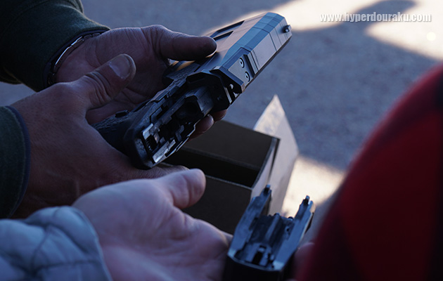 S&Wの新型はM&P9 M2.0。 グリップの滑り止め加工がより細かくなり手に食いつくようになった。また、インナーシャーシを延長してフレームの剛性をアップさせている。