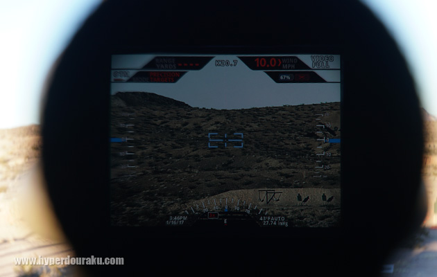 スコープを覗くとこのように電子ファインダーに映像が映り、ブルーのクロスゲージにターゲットを合わせ、トリガーを引くと、その時点では弾は発射されず、距離に応じた赤いレティクルが表示される。