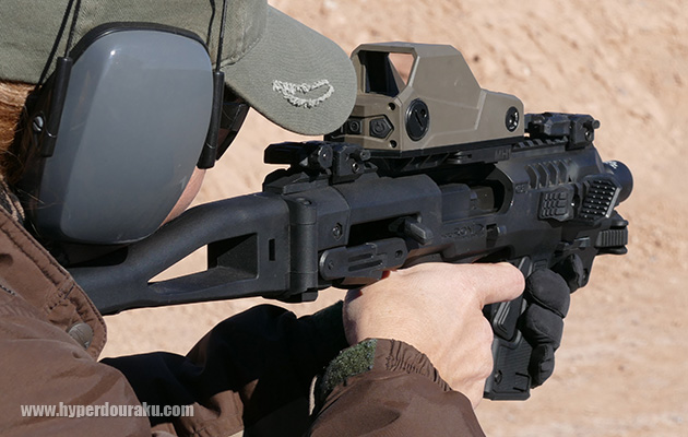 CAAのMicro RONIピストルカービンコンバージョンキット。以前のものに比べてボディ下面から簡単に拳銃をセットできるようになった。またフォールディングストックを折りたたんでも撃つことができ、サムレストやスペアマガジンが収納可能なフォアグリップなども備える。