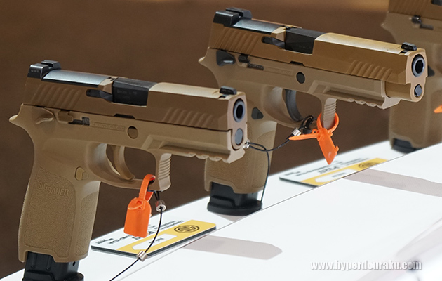 昨年のSHOT SHOW 2017期間中に、米軍のMHSトライアルを勝ち取ったニュースが世界中を駆け巡ったSIG P320。今年は米軍制式拳銃のM17/M18のミリタリーとコマーシャルモデルが展示されていた。